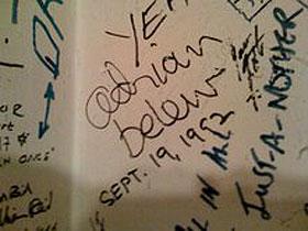 Backstage at the Warfield, Matt remembered my story about meeting King Crimson there (backstage is actually underneath the stage) and sends along this snapshot of Adrian Belew's signature. My old story goes: I was actually carrying on a conversation w/ Adrian Belew (I was guest of Tim, their lighting guy) when drummer Pat Mastelotto called out to me in excitement regarding my Bad Livers t-shirt. He told me how he had moved to Austin and wanted to join Mark Rubin's klezmer project, but was flat-out rejected. I can hear Rubin now: "NOPE, don't need a drummer!"
